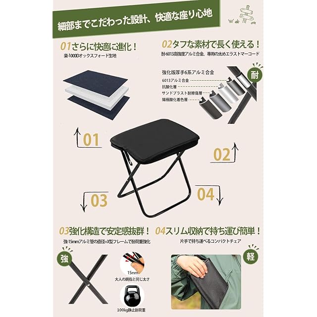 【耐荷重・長持ち】 キャンプ 椅子は丈夫で耐久性のある1000Dオックスフォード生地を採用し、フレーム部分は十分な強度を有している7075アルミニウム合金で作られています。耐荷重、頑丈で安定性のある折り畳み 椅子。大柄な男性が座っても平気な丈夫さで、ご家族、お友達、みなさまお使いいただけます。
