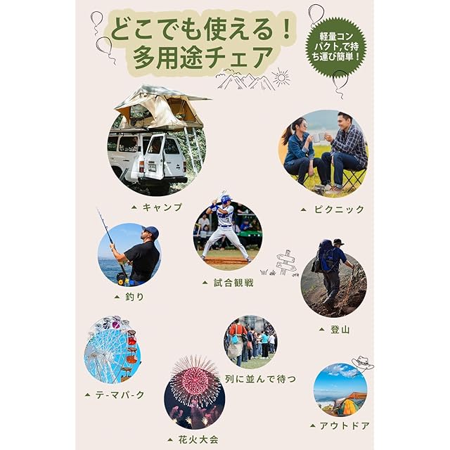 【いろんな場所で活躍】 万博、アウトドア、運動会、釣り、キャンプ、BBQ、 トレッキング、登山 、お花見、花火大会 、バーベキュー、子供様のスポーツ観戦、野外フェス用品など、折りたたみ椅子コンパクトなので携帯していれば、待ち時間にちょっと座ることもできます。