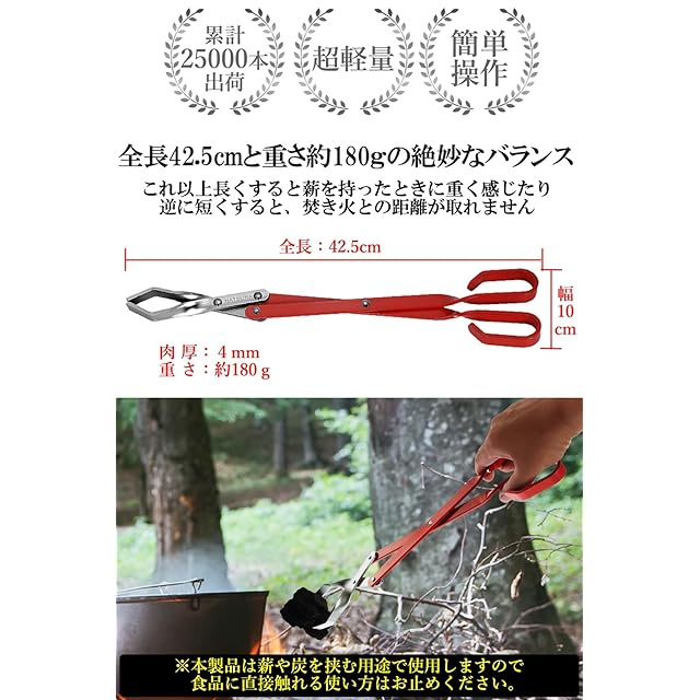 【全長42.5cmと重さ約180gの絶妙なバランスの薪ばさみ】焚き火と距離を保ちながら薪や炭をくべることができます。しかも、この火バサミは180グラムと軽量ですので、はさみを持った時の負担が少ないです。これ以上長くすると薪を持ったときに重く感じたり 、逆に短くすると、焚き火との距離が取れません。