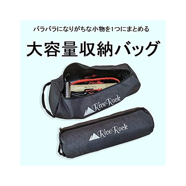 大容量収納バッグでキャンプ道具、ペグハンマー、スチールペグ、ロープ、自在金具などを1つにまとめられます。