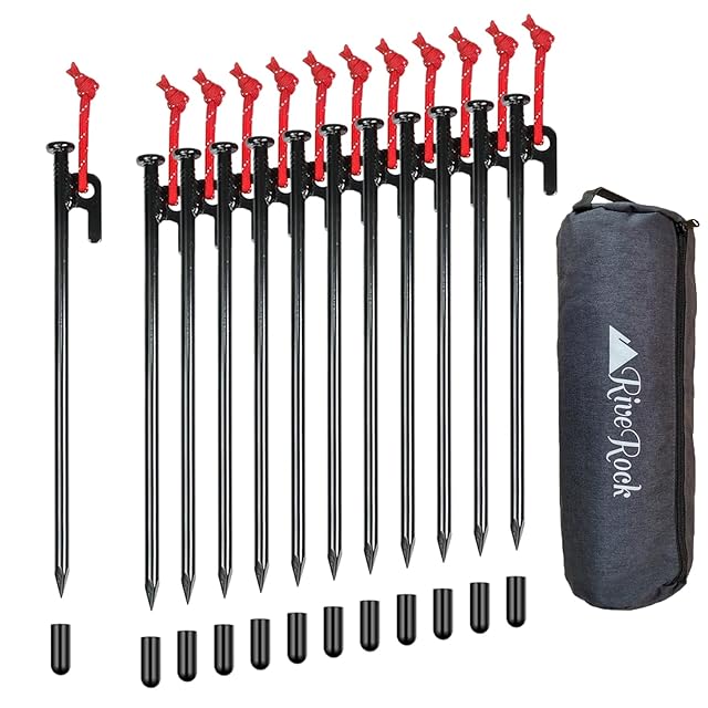 RiveRock(リバロック) 30cm ペグ 収納 バッグ テント タープ スチールペグ 反射ロープ 安全キャップ付き (30cmペグ12本/収納バック)