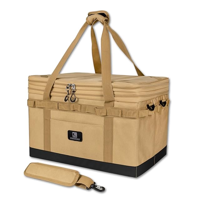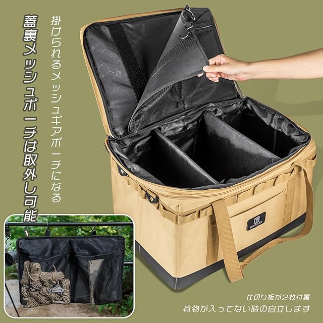 小物も楽に収納できる機能:⭐上蓋のメッシュポケットは取り外して吊り下げることができます。照明系・カトラリー系・調理ツールなどすぐに必要な小物収納には丁度いいです。⭐ギアの形によって自在に位置調整できる仕切り板2枚付き、中身が整理整頓で移動中ギアお互いの衝突による傷も防ぎます。⭐外側にはフロントポケットとカラビナループ搭載、シェラカップ、ペグなど乱雑になりがちな物の収納にはピッタリです。