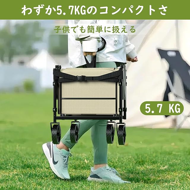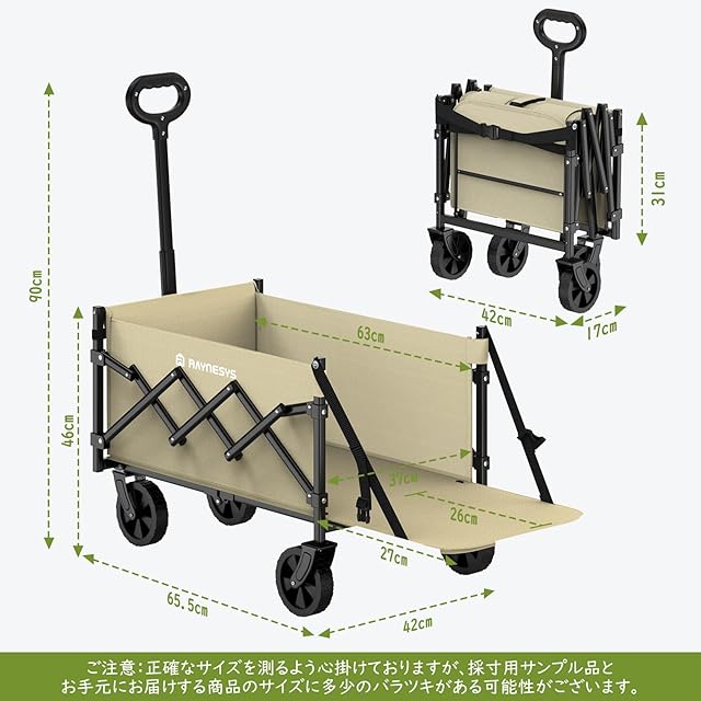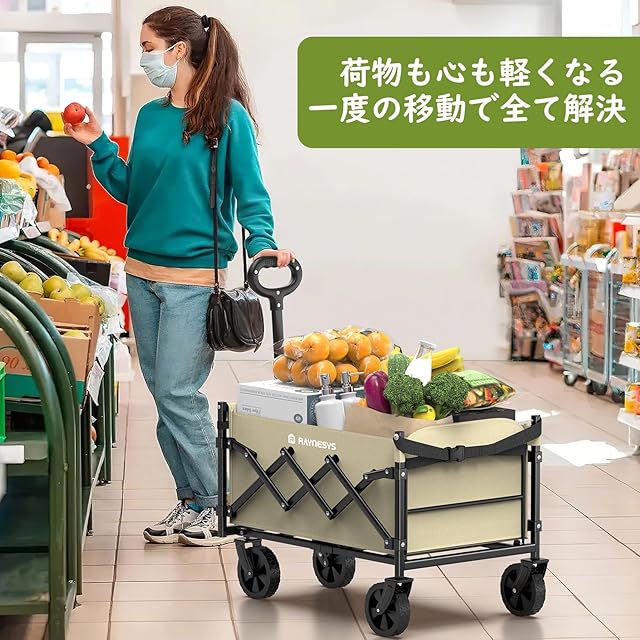 Raynesys キャリーワゴン 【2025新登場】【後部展開可 長物対応】 ミニ 超軽量5.7kg 高耐荷重100kg 容量65L-90L キャンプカート アウトドアワゴン 折り畳み式 持ち運び便利 コンパクト 自立収納 静音 多地形対応 キャンプ/砂浜/釣り/引越し/買い物/ゴミ出し ベージュ