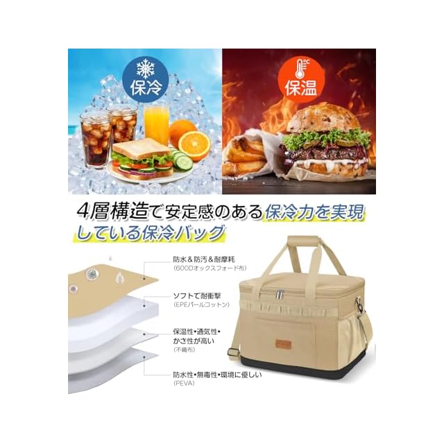 【徹底した四層構造×強力保冷】本クーラーボックンの核心は「900Dオックスフォード防水布+EPE断熱層+不織布吸湿層+PEVA防湿ライナー」の4層構造。EPE層が外部の熱を遮断し、内部の冷気をより長時間キープ。不織布が結露を吸収、PEVA内張りで液体漏れを完全ブロック。氷を入れれば飲み物が10時間以上キンキンに冷えたまま!魚介類や乳製品の鮮度保持にも最適で、アウトドアだけでなく日常の買い物袋としても大人気。断熱性能試験済みの信頼設計で、真夏のバーベキューでも安心です。
