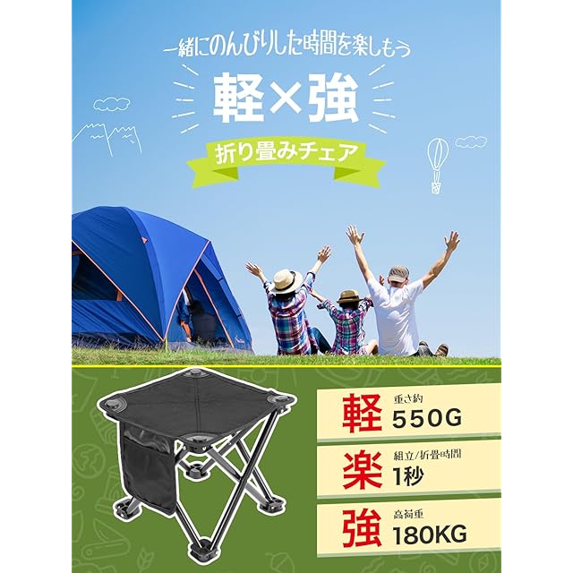 【多用途対応!アウトドアシーンで大活躍】折り畳み椅子の携帯専用バッグも付いて、収納後サイズは約10*10*31cmで、コンパクトサイズ椅子になり徒歩でも移動時でもなど、いつも便利に持ち運びます。キャンプ、BBQ、釣り、花見など、さまざまなアウトドアシーンで活躍。コンパクトなのに耐荷重180kgで大人も安心です。【Mediumコンパクトサイズ】展開の高さが約23cmで、低高度の方が女性や子供にもおすすめですし、リラックスできるために、自然に近い感覚でくつろげます。