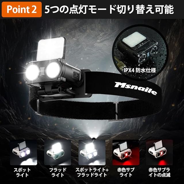 Msnaile キャップライト 充電式 ヘッドライト 【900ルーメン・4〜70時間連続点灯・無段階調光・赤色サブライト搭載・180°角度調整・IPX4防水】 釣り・キャンプ・作業用 帽子&ヘルメット対応 収納ボックス&日本語取扱説明書付き
