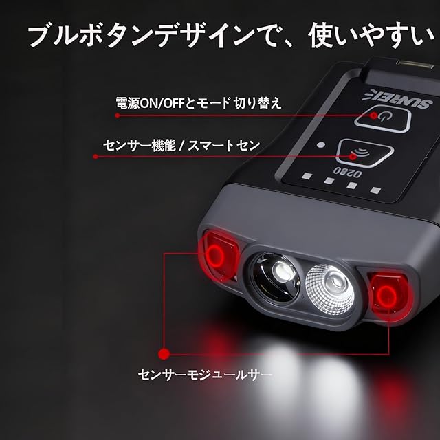 【260ルーメンの高品質な集中光束 & 手をかざすだけのジェスチャー操作】 長時間のアウトドア使用や精密作業を想定し、目に優しい光質に徹底的にこだわりました。260ルーメンの明るさと5700Kのクリアな白色を、色ムラ・チラつきゼロで実現する高品質LEDを採用。その美しい光を一点に集める精密光学設計により、このヘッドライトは、暗所でもクリアで疲れにくい聚光視界を提供。単なる明るさではなく、使い心地へのこだわりを感じさせる光束が、あらゆるシーンであなたをサポートします。モーションセンサーを搭載しているので、点灯中にセンサーを“有効”に切り替えれば、スイッチを押す事無く、LEDの前で手を通過させるだけで消灯と点灯を繰り返す事が可能になり、とても便利でした。