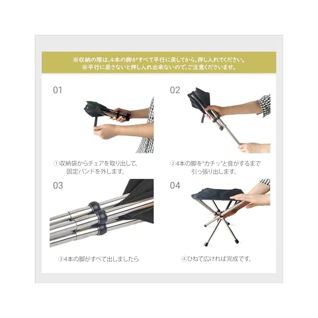 【瞬間組立・携帯便利】4脚伸縮イスの設置は脚を伸ばして広げるだけで簡単です。超軽量折りたたみいす、傘のような伸縮の構造なので一瞬で組み立て完了。組み立てやすい構造で、足を伸ばして広げるだけで簡単にセットできるため、子供や女性の方にでも楽にセットできます。収納時の長さは26センチだけで、リュックなどにも入ります。