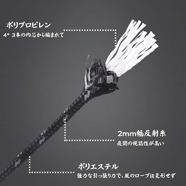 強い反射性:他社の製品では通常1本の反射材ワイヤー入りところを、このロープは2本の反射材入りワイヤーが編み込まれています。わずかな光があれば視認性を高めます、夜でも足を引っ掛けることもご心配なく