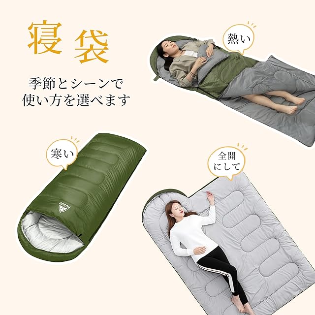 ◆ オールシーズン対応 & ゆったりサイズ! 3種類の保温性で季節を選ばない快適さ◆約210×75cmの広々サイズで、身長150~190cmの男女が楽に寝返り可能! 1kg / 1.4kg / 1.8kgの3タイプをご用意。1kg:快適温度10℃〜25℃ (最低0℃)、1.4kg:快適温度0℃〜15℃ (最低-5℃)、1.8kg:快適温度-15℃〜0℃ (最低-15℃) (個人の体感差あり)。夏のキャンプから厳冬期まで、シーンと体感に合わせて最適な一枚を選べます。封筒型デザインで厚着時の圧迫感ゼロ!