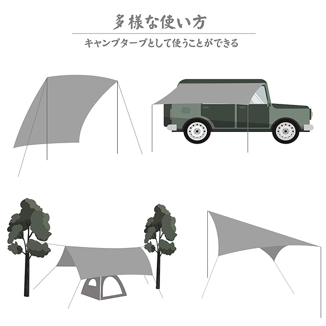 【多様な使い方】グランドシート以外にも レジャーシート としても、ピクニックやキャンプ、花火大会、海水浴、運動会など、様々な用途に大活躍! また、タープシェルターとして、雨宿りをしてもいいです。広い面積を確保した軽量レジャーシートです、数人一緒に使られます。