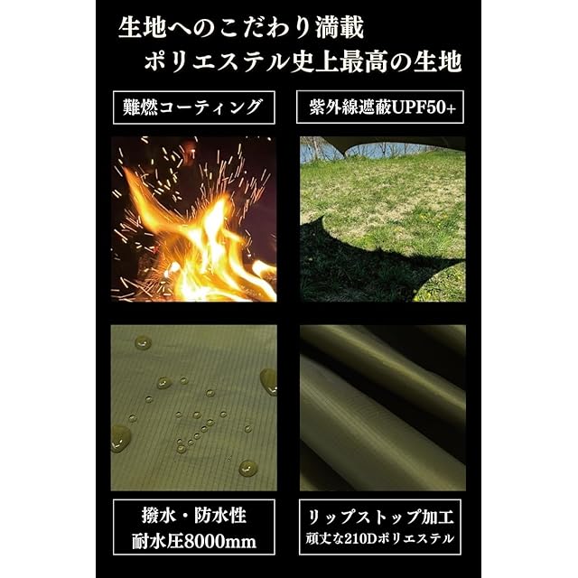 【難燃加工】 タープ生地に難燃性塗料を加えることによって、ポリエステルタープの最大の弱点である燃えやすさを克服。焚き火の火の粉が飛んでも穴が空きにくく、燃え広がりにくい素材を提携工場と開発!TCタープより軽い、影が濃い、高耐水圧、速乾性があってメンテナンスが楽。使い勝手の良いタープに仕上げました。