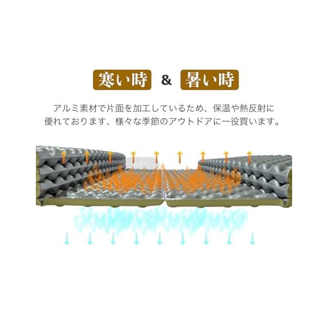 【優れた保温性と遮断性】アルミ+XPE複合素材採用で、卓越した断熱効果を実現。特殊波形デザインが空気層を形成し、夏は涼しく冬は暖かく。マットのアルミ面を下にすると地面の冷気を遮断し、反射した体温で熱を保ちます。アルミ層が熱を閉じ込め保温効果を持続させます。