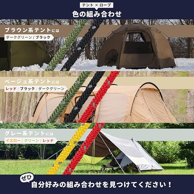 <業界最高水準の強度>ロープの材質は劣化に強い1500Dポリエステルです。耐荷重は350kg以上(弊社で計測済み)!どんな悪天候やどんな場所でも5mm設計のDaLaCaロープがテントやタープをしっかりと固定します。