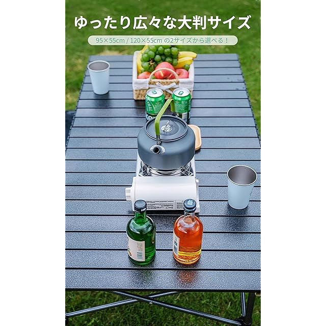 【シーンで選べる2サイズ展開|用途に応じてぴったりサイズを】95cmと120cmの2サイズ展開で、ソロキャンからグループまで幅広く対応。アウトドア 折りたたみ テーブルとして万能に活躍します!