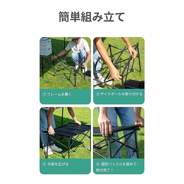 【3ステップ簡単設営|誰でも扱いやすい折りたたみ構造】フレームを開く → 側面ポールを取り付ける → 天板をセットするだけの組み立て簡単 テーブル。初めての方でも迷わずスムーズに設営できます。