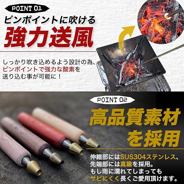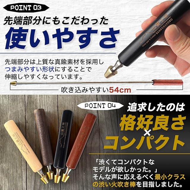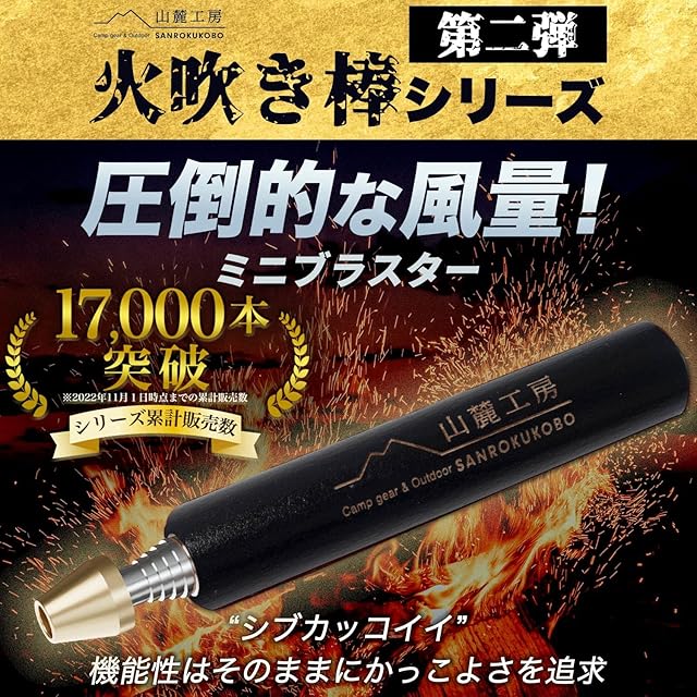 ✅【山麓工房火吹き棒シリーズ第二弾!】山麓工房の大人気商品火吹き棒の第二弾、キャンプやバーベキューの際に役に立つ火吹き棒です。その名もミニブラスター。焚火の火が弱まってしまったとき、ピンポイントに酸素を送り込むことによってうちわなどとは違って灰が飛び散らず、火を何度も燃焼させることができます。「渋さ」「コンパクトさ」「吹きやすさ」にこだわりました。