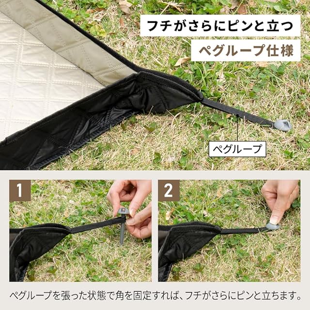【風の強い日でも安心!ペグ・ペグ穴付き】マットの四隅のペグ穴に専用ペグを差し込めば、しっかり地面に固定でき、風が強い日もめくれ上がる心配がありません。