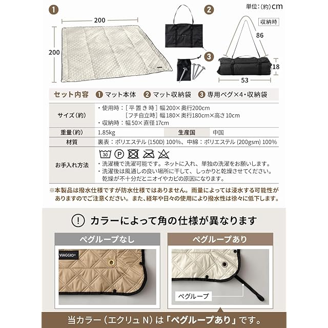 Viaggio+ レジャーシート 厚手 大判 200×200 キルティングピクニックマット (エクリュN)