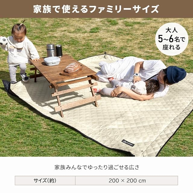 【家族で使えるファミリーサイズ】家族みんなでゆったり過ごせる、約200×200cmの大きめサイズ。大人5~6人が座れる大きさです。テント内のインナーマットとして、折りたたんでコットやアウトドアベッドのクッションとしてのご使用もおすすめです。