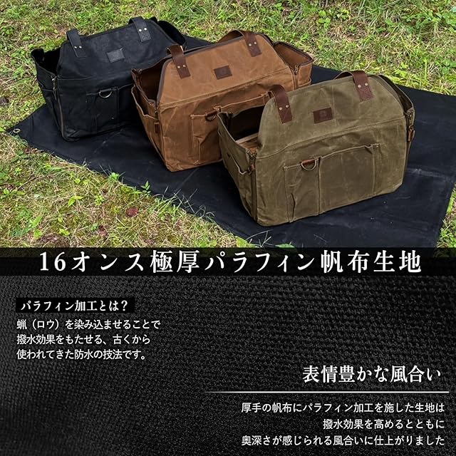 【深みのあるオリジナル生地】16ozの極厚パラフィン帆布生地を使用。パラフィン加工とは、蝋(ロウ)を染み込ませることで撥水効果をもたせる、古くから使われてきた防水の技法です。使い込むほどに白っぽい折り目のあとやシワ(チョークマーク)が刻まれるのが特徴です。製品特性をご理解の上、味わい深い風合いをお楽しみください。