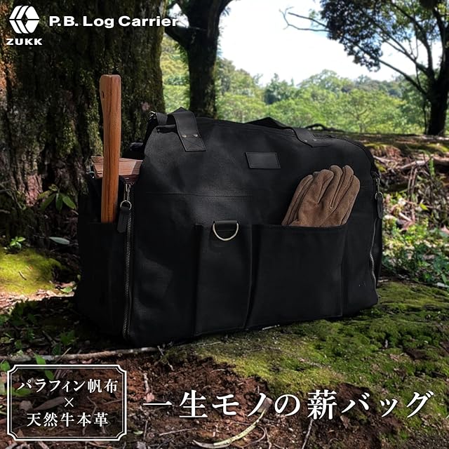 ZUKK 薪バッグ キャンプ 焚き火 ギアバッグ 本革 極厚帆布 容量50L 高耐久 パラフィン 自立式 撥水 ログキャリー 薪スタンド (オールブラック)