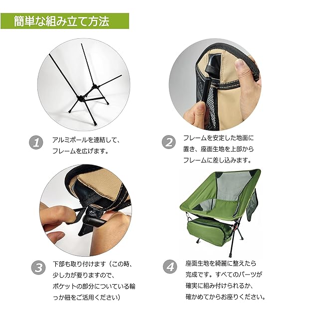 【様々な場所で大活躍】この折り畳み椅子は様々なアウトドアで活躍します。キャンプ、釣り、ハイキング、トレッキング、登山、 花火大会 、運動会、お花見など、シーンを選ばず、どこでもいつでも気軽に使えます。合宿ゼミなど室内環境でも快適に楽しめます。お品物については私どもが検品をさせていただいておりますので、どうぞご安心していただきお買い物お楽しみ下さいませ。