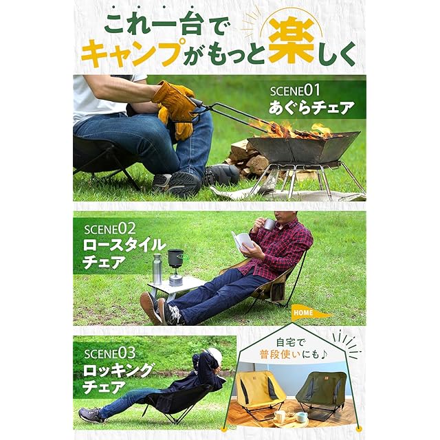 【あぐらチェア】焚き火台のサイズに合ったアウトドアチェアなので、あぐらをしながら焚き火や料理を楽しめます。ソロキャンプやアウトドアに最適です。【ロースタイルチェア】約850gと軽量コンパクトなので持ち運びしやすく、バイクツーリング・釣り・徒歩キャンプ・夏フェスにぴったりのキャンプ椅子です。