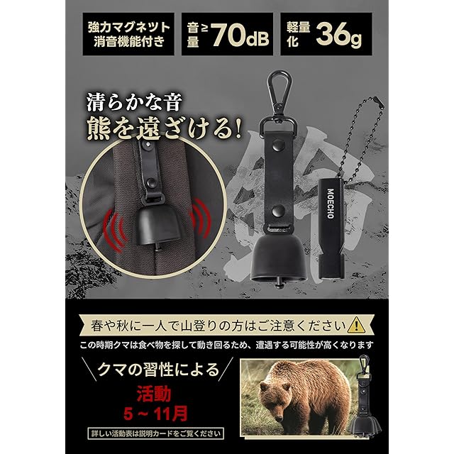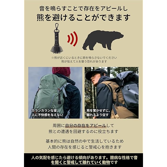【音が良く響き・クマに聞こえやすい】清らかで澄んだ音は遠くまでしっかりと届き、熊に自分の存在を伝えます。川や雨風の音にかき消されることがなく、熊を驚かせずに、離れるよう促すことができます。カランカランとした音は、人にとっても気になりません。*クマとの遭遇を100%回避することはできませんので、ご注意ください