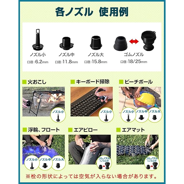 ✅【商品詳細】 ■サイズ:(約)幅4.8cm×奥行き4.7cm×高さ8.7cm、アダプターサイズ:(約)小:5.5mm / 中:11.8mm / 大:18mm、25mm■材質:ABS樹脂、PP樹脂■重量:(約)120g■吹出量:170L/分■付属品:ノズル(4種類)、充電用USBケーブル(Type-C)■入力電圧:DC5V■バッテリー容量:1,400mAh■充電時間:(約)1.5~2時間※フル充電時のエアーポンプ使用可能時間めやす:25分(15分以上連続で使用しないでください)、連続使用可能時間:15分※エアーポンプ使用時■LEDライト明るさ(ルーメン):45lm / 230lm / 410lm■LEDライト色温度:昼白色:4,200K、連続点灯時間:45lm:11時間 / 230lm:5時間 / 410lm:3時間■※商品は、モニターによって色合いが異なって見える場合があります。 また、仕様・デザインは改良のため予告なく変更することがあります。