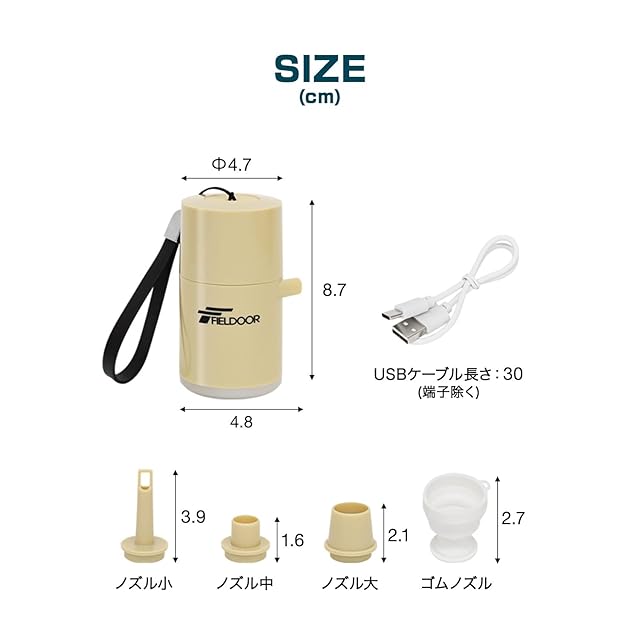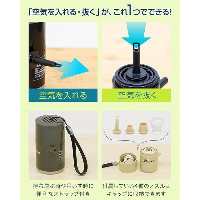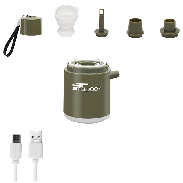 FIELDOOR 電動エアーポンプ コンパクト USB充電式 LEDライト内蔵 1400mAh 軽量 約120g キャップに収納できる4種類のノズル付き プール浮き輪等の空気入れ ブロワー 火起こしにも [オリーブ]