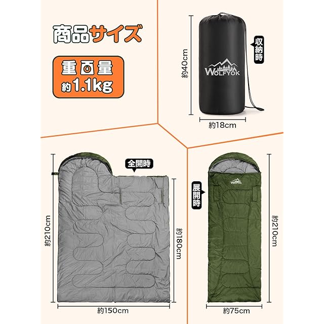 【オールシーズン寝袋&寝心地が良い】✅wolfyok outdoors寝袋は-15°Cから25°Cまですべての季節に使用できるオールシーズン寝袋です。ニーズや季節に応じて適切なキャンプ用寝袋をお選びいただけます。 夏秋用の寝袋としては1.1kg、秋冬用の寝袋としては1.4kg、冬用の寝袋としては1.8kg、厳冬用の寝袋としては2.2kgを選ぶのがおすすめです。✅布団に近いゆったり感が魅力の封筒型寝袋です。マミー型よりもゆとりのあるサイズなので窮屈さを感じにくいでしょう。✅両手両足を広げて横になれるほど広くてゆとりがあり、圧迫感はありませんでした。また、スペースがある分、ストレスなく大きな寝返りが打てます。✅中綿の充填量が多いため、頭と背中のクッション性があり、包まれるような感覚が得られます。肉厚とはいえないものの、頭や背中もふかふかとした感触があります。✅【実用性が抜群】夏にキャンプに行っても河原、林間、海辺など、昼と夜の気温差が大きい場所を選ぶ場合は、保温のために比較的厚い寝袋が必要です。