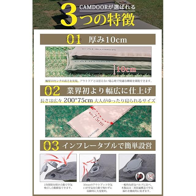 CAMDOOR キャンプ マット エアーマット 厚手 10cm/8cm【30秒自動膨張・超広幅75cm】R値 6.8 インフレーターマット 車中泊 インフ コンパクト 自動膨張 キャンプ用品 寝具エアーベッド 防水防潮 安全無臭 持ち運び便利 簡単収納 収納袋付き