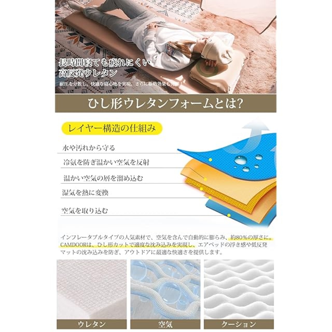 ✅ 【市場とは異なる堅牢な素材】令和6年最新進化版です!エアマットレスの正面は210T複合PVC+高反発スポンジ素材。高い強度の防水性を持って、汚れてもタオルで拭き取れば大丈夫です。人間工学に基づいてデザインされたキャンプマットは深い睡眠を促進し、体の自然な形状を維持し、ソフトな手触り、高反発。 地面との接触はありません!ぐっすりと眠ることができます。自動膨張式スリーピングパッドの裏面は滑り止めです。 どんなシーンでもしっかり使えます。 エアマットの裏側はポリエステルで、太い枝を使って強く切っても破れにくい素材です。