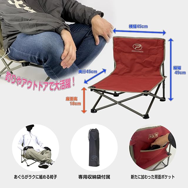 フィッシングやアウトドアなどで大人気!収納や持ち運びに便利な折り畳みチェア☆チェアの高さを低くし、あぐらの組みやすい設計。ゆったり座れるワイド座面。安定感抜群の座面高18cm。