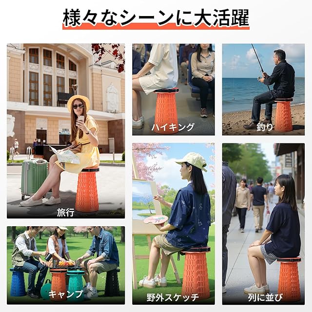 「自由に調整可能」調節可能の折りたたみ椅子は需要によって9段階高さをできて、他の調整できないスツールと比較して、更に柔軟に対応してくれます。各年齢層によってちょうどいい高さを調整して対応するので、座ることが不便と心配しなくてもいいです。小型で、どこかへ持ち運ぶのも便利で、登山、旅行、お釣り、キャンプ、バーベキュー、野外スケッチ、列に並ぶというシーンに使用するのは便利です。