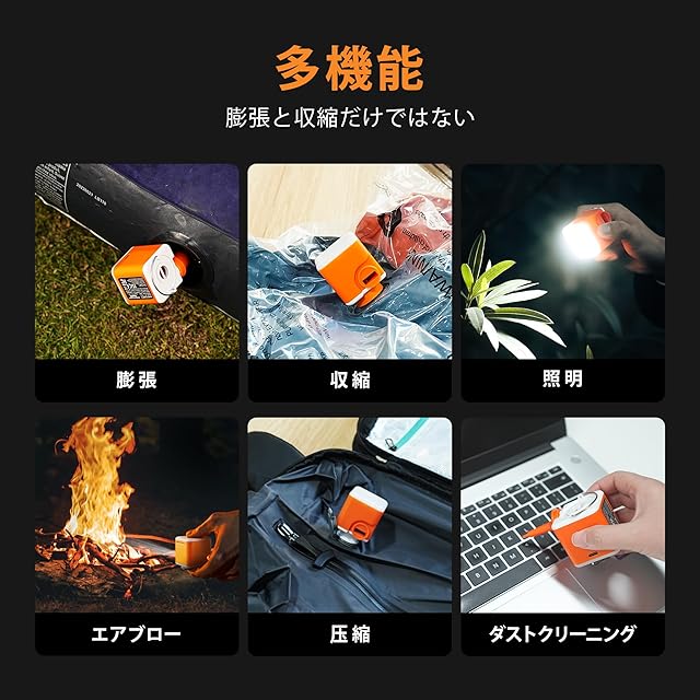 NANO PUMP 5 エアーポンプ 空気入れ 電動 4.5 kPa 4.6*4.6*5.1cm 2400mAh大容量バッテリー USB充電式 3つのキャンプライトモード 軽量インフレータブルクッションエアポンプ 強力な膨張/収縮 屋内外に適用 エアクッション 真空バッグエアポンプ(オレンジ)