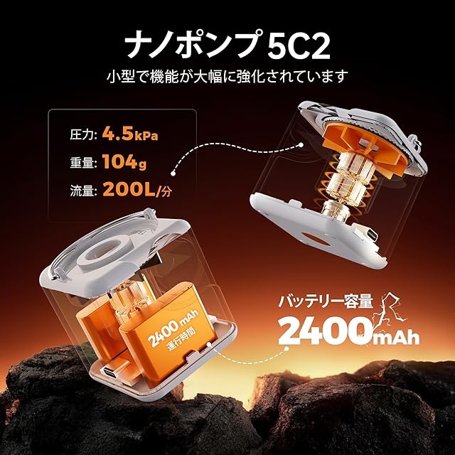 【ミニサイズと携帯性】NANO PUMP 5の重さはわずか104g、サイズ:46*46*51mm、エアポンプは卵と同じくらい小さくて軽いです。キャンプや休暇に行っても持ち運びが簡単で、スペースを取らずにバックパックや車に簡単に収まります。