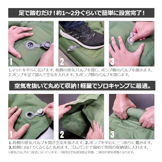 ✅足踏み式エアーマット。幅70cm、長さ195cmの大判のマットレスなので大柄の男性でも足を延ばして寝ることができます。口で空気を吹き込んだり、手動のエアポンプや電動空気入れは不要。足踏み式エアポンプが内蔵されているので、約1分ぐらいで簡単に膨らませることができます。マットと枕が一体型なのでキャンプ場に枕を持っていく必要がありません。使用後は空気を抜いて丸めてゴムバンドで留めるだけで簡単に片づけることができます。持ち運びに便利な収納袋付き。透明タイプの補修テープ付きなので、焚き火の火の粉などで小さな穴が開いてしまっても安心です。