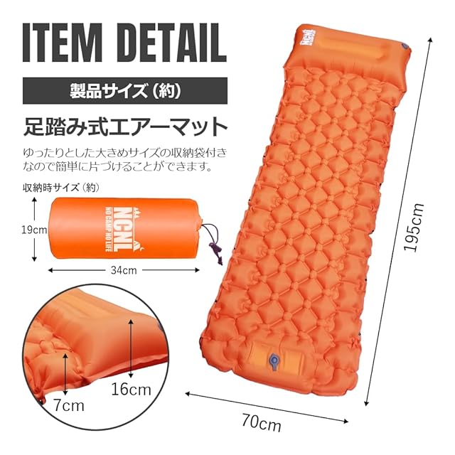 NCNL(NO CAMP NO LIFE) エアーマット 【厚さ約7~16CM】 キャンプ 車中泊 マット 足踏み式 枕付き エアーベッド コンパクト 軽量 大型 195cm 厚手 簡単収納 無限接続可能 災害用マット 防水 ソロキャンプ アウトドア用品 補修テープ付き 収納袋付き (オレンジ)