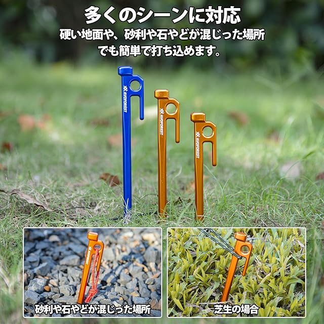 ✅【強度があるのに軽い】:アルミ素材ならではの抜群の軽さに加え、大型テントやタープでも安心して使える強靭さを併せ持つ、業界初のアルミ鍛造ペグです。