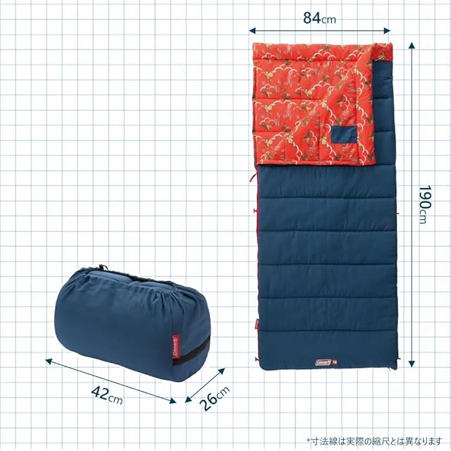 【ゆったり眠れる封筒型】幅84㎝のゆったりサイズなので、自宅の布団のような抜群の寝心地を提供します。ファスナーをすべて開けることで1枚の掛け布団のように使用することもできます。