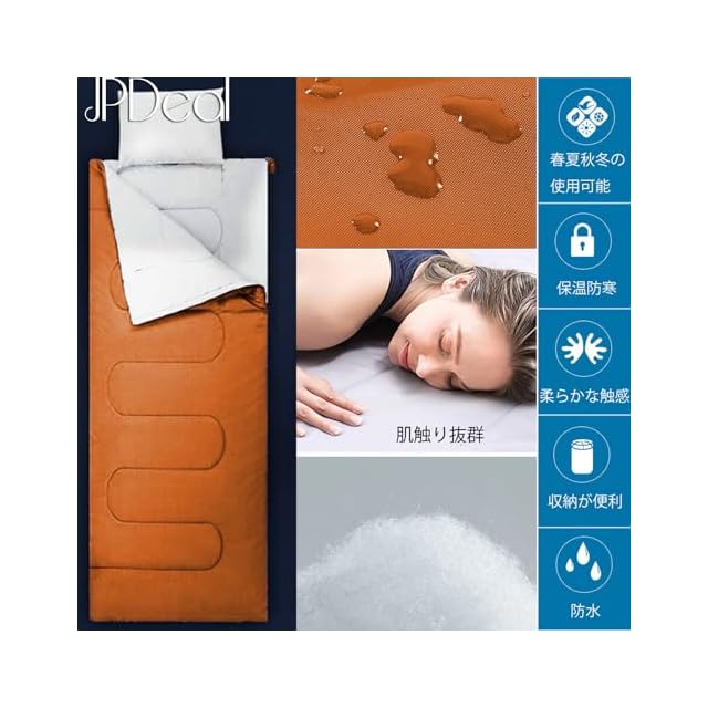 JPDeal 寝袋 封筒型 1.0kg 枕付き 210T防水シュラフ 保温 軽量 コンパクト アウトドア 登山 キャンプ 車中泊 丸洗い可能 収納パック付(オレンジ)