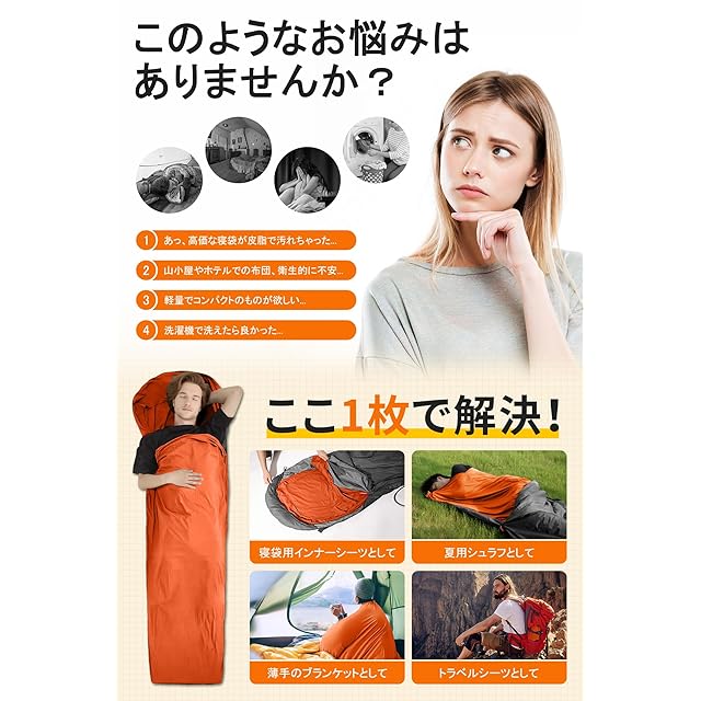 【オールシーズン対応・大活躍】秋冬のインナーシーツというより夏のキャンプの極薄寝袋でも考え購入される。山小屋泊、⾞中泊、テント泊、登⼭、キャンプなどのアウトドアシーンはもちろん、ホテル泊における簡易シーツ代わりや、夜勤のブランケット代わりとして。さらに、地震などの災害における⾮常⽤寝具としても⼤活躍しています。軽量コンパクトなので、どこに持ち歩きにも助かります。