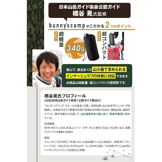 【プロ登山家との共同開発】 インナーシュラフ (従来品より55gも軽い超軽量) インナーシーツ 寝袋 封筒型【国内検査済みの素材を採用】 キャンプ 登山 山小屋泊 車中泊 bunny’scamp (カーキ)