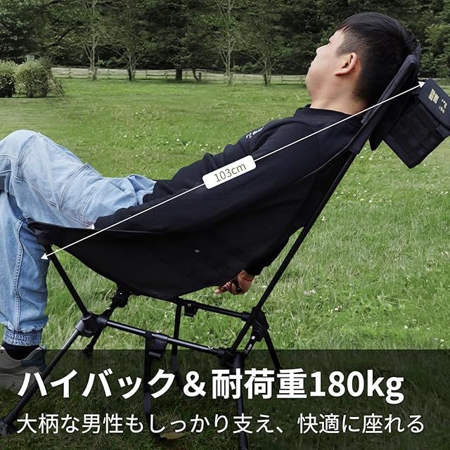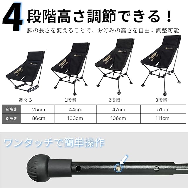 【高さ&角度調整でお好みのスタイルに!】4段階の高さ調整&3種類の角度調整で、どんなシチュエーションにも対応!リラックスモードではゆったり背もたれ、食事や作業時はしっかり安定姿勢。アウトドアでの快適さを追求しました!
