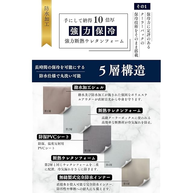 【本格アウトドア仕様、断熱5層構造で冷たさ持続】24時間後も投入した氷が残存、本格アウトドア仕様のクーラーバッグ並の性能を実現しました。どんなシチュエーションでも中身のランチやドリンクの冷たさを保ちます。