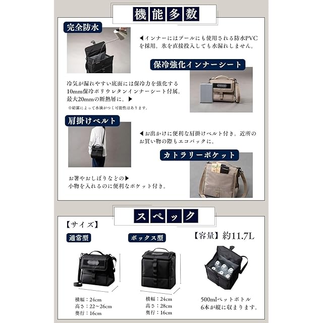 【機能多数】インナーは完全防水仕様で氷を直接投入可能。また肩掛け可能なベルトやカトラリー等を入れるのに便利なポケット等欲しい機能を詰め込みました。
