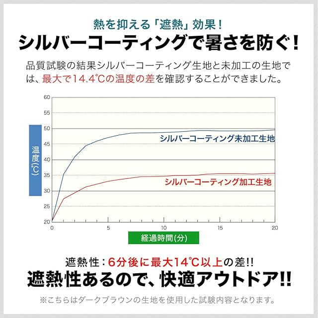 ✅【真夏の暑さ・紫外線から守る!】 生地の裏面には紫外線から守るシルバーコーティングも施されています。アウトドア・レジャーなど屋外で使用するには申し分ない仕様です。