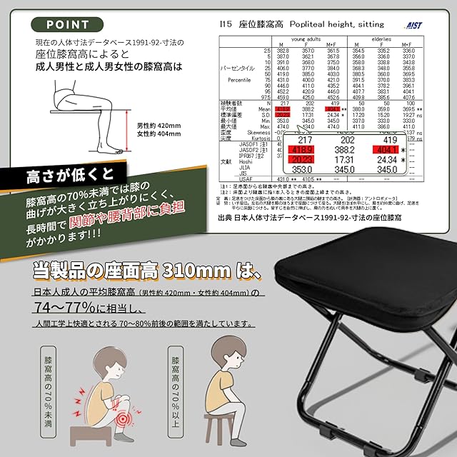 【人間工学折りたたみ椅子】現在の人体寸法データベース1991-92-寸法の座位膝窩高によると、座面高26.5cmは、多くの方の膝窩高に適合し、人間工学的にも快適にお使いいただけます。座面の高さが高すぎると、大腿部裏側が強く圧迫され、血液循環や神経を刺激し、痛みやしびれの原因となります。